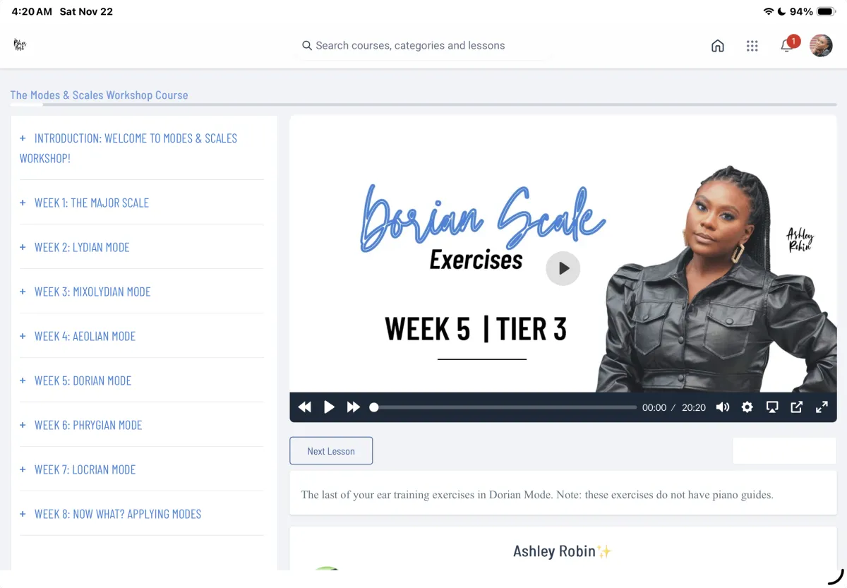 Ashley Robin got her start in teaching in 2011, and she’s since had the pleasure and privilege of teaching students across the United States and abroad. In recent years, she’s developed a name for herself as an ear training and musicianship coach. She is best known for her content surrounding the modes of the major scale, but also teaches general ear training, vocal technique, performance technique, songwriting, arranging, and production via her self-owned virtual academy, The Robin’s Nest.